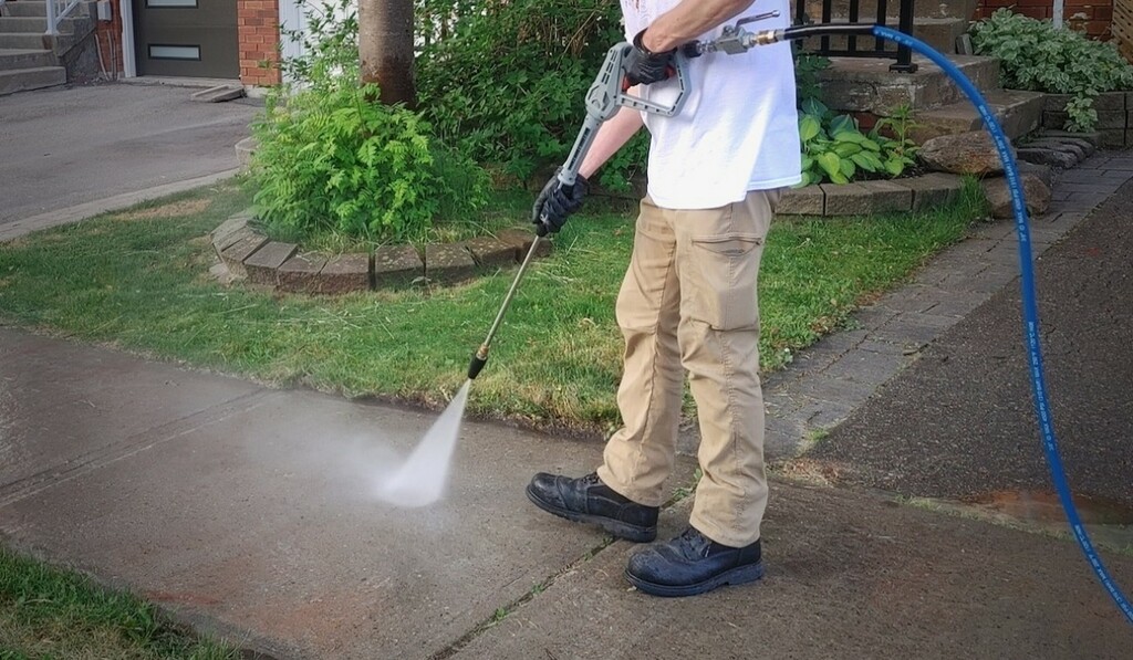 For large, flat areas, we often use a 'surface cleaner' which looks like a lawnmower on casters. Instead of a spinning blade, it has a spinning bar with high pressure nozzles that scour the dirt and grime from concrete, stone, pavers and other hard surfaces.